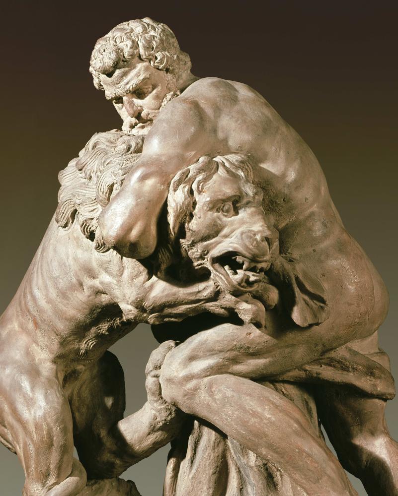De eerste opdracht was de leeuw van Nemea verslaan, een wild beest dat de hele streek terroriseerde. Een heroïsch gevecht dus op leven en dood. De gespierde Hercules overwon. Op Quellinus’ beeld Hercules en de leeuw van Nemea houdt de halfgod de leeuw klemvast.